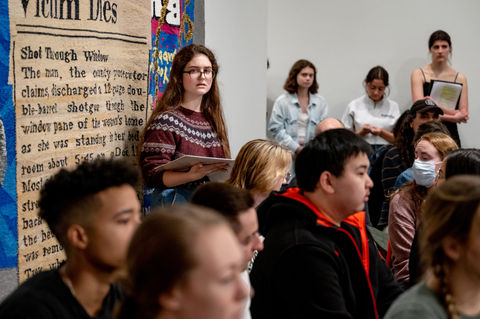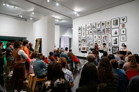 Palindrome is an absurdist play, written by playwright and novelist (and past Theater Dept. playwriting professor), Julia May Jones, and directed by Visiting Assistant Professor of Theater, Ji Won Jeon, featuring the talents of Penn Hoen ‘24, Aminah Hopewell ‘26, and Isadora Zucker ‘25. The play takes place in a museum, not far off from the Tang, with the actors physically moving around the space as they perform. At first, I found myself dazzled and confused by the strange sentences the actors spoke, but as the three actors danced around the space, making jokes about the miracle of birth, I was able to put the pieces of the puzzle together. The piece itself is a palindrome, except instead of having sentences that meant the same thing forwards and backwards, the lines took on different meanings when said in different orders, by different actors. As for the art pieces in the gallery, their presence in the space was a performance in itself, showing the faces of different strangers who, at first glance, we’d know nothing about. Palindrome was the best play to start the night off with, in my opinion, because it acted as the thesis for the whole event; how do our words and actions resonate with the people around us, and how are we connected to the people we consider strangers?